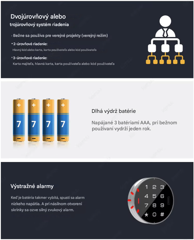 Správca môže odomknúť všetky skrinky. Signalizácia batérie akusticky aj v mobilnej aplikácií.