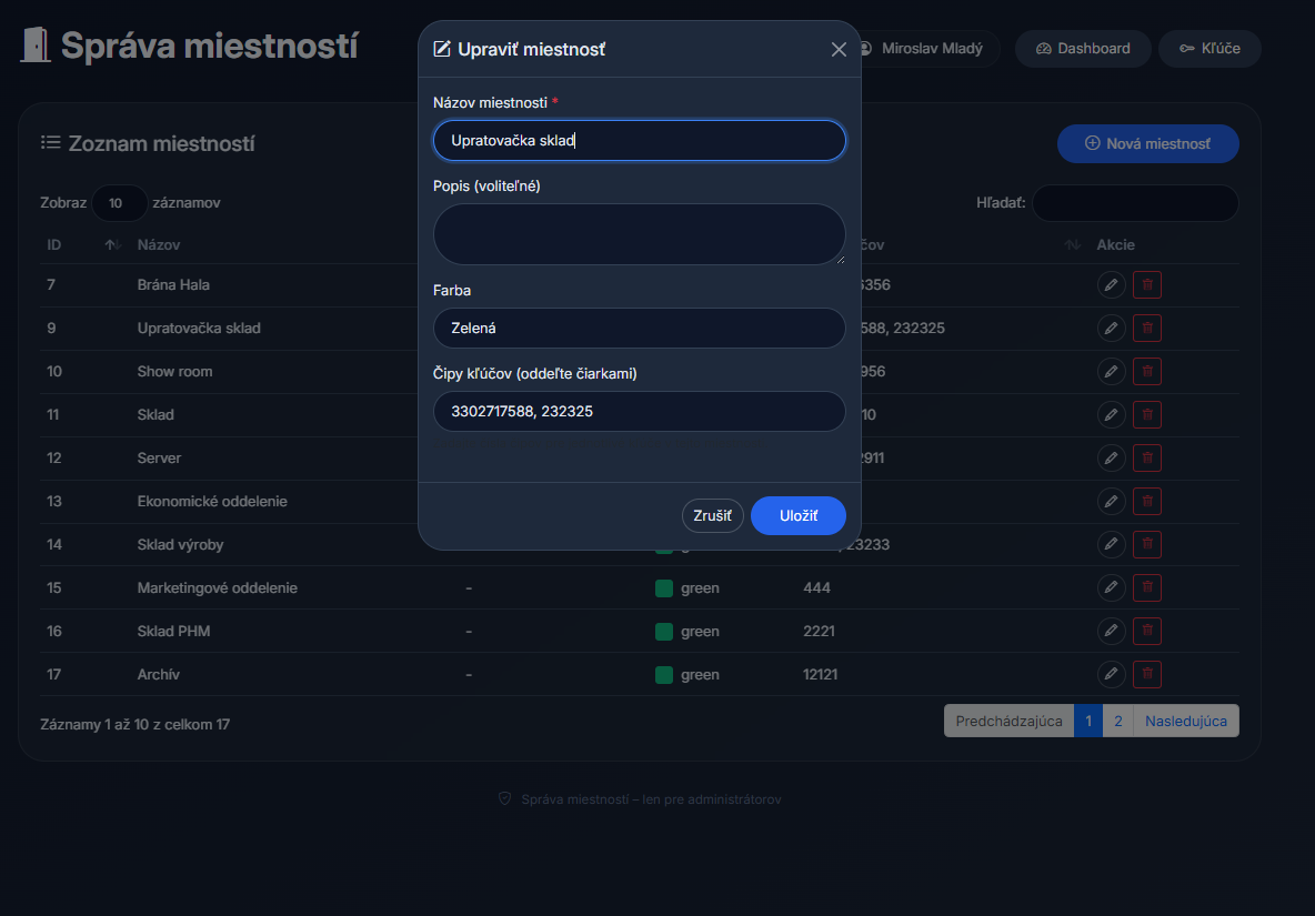 🔹 Detail miestnosti – prehľad všetkých kľúčov s možnosťou rýchlej akcie