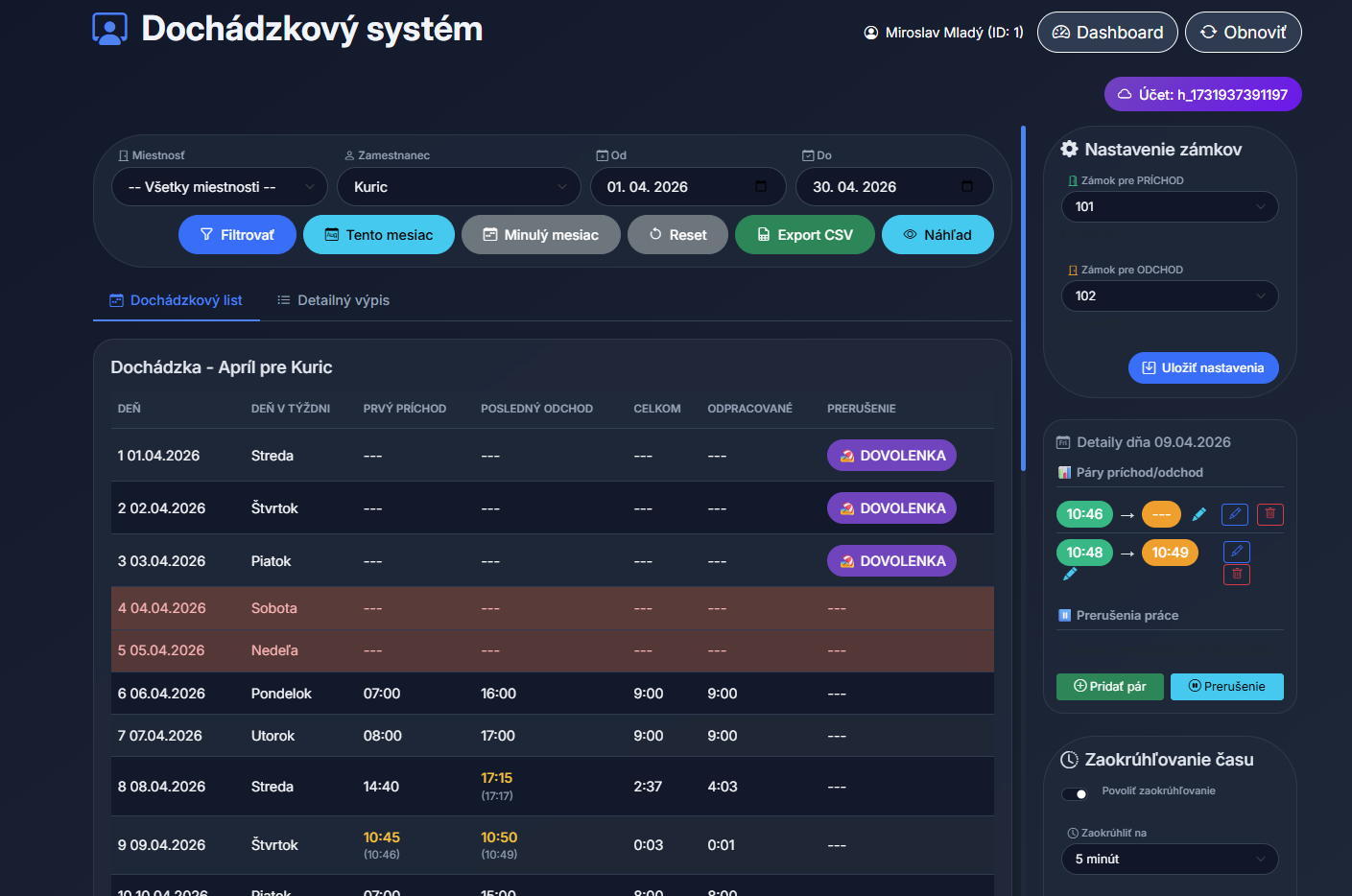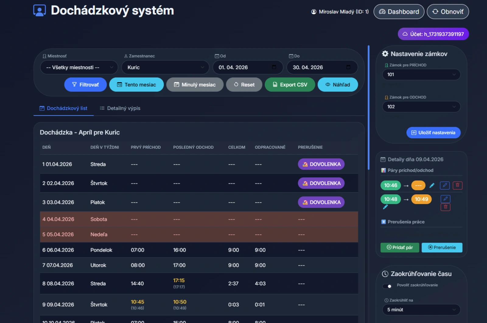 Možnosť zaazanmenávať dochádzku zamestnacov. Stačí zvoliť záok na príchod a zámok na odchod.